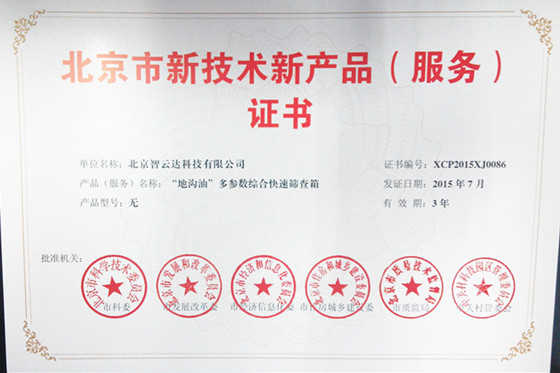 北京市新技術新產品(服務)證——“地溝油...