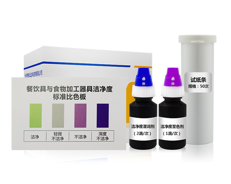 蛋白質和糖類是微生物滋生繁衍的溫床,同時也是細菌菌體的組成部分,餐飲具或食物加工器具上遺留或污染的蛋白質或糖類物質,可與特定試劑反應出現不同顏色,由此可通過與對照色卡比對判斷被檢物體表面潔凈的程度。
