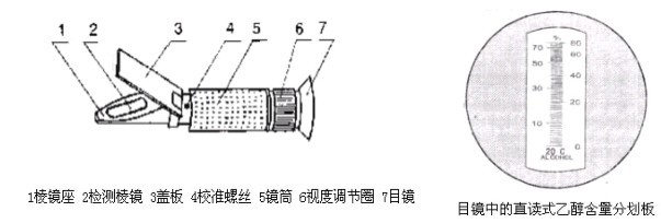 在 20℃時,水的折光率為 1.3330,隨著水中乙醇濃度的增加其折光率有規(guī)律地上升,當甲醇存在時,折光率會隨著甲醇濃度的增加而降低,下降值與甲醇的含量成正比。按照這一現(xiàn)象而設計制造的酒醇含量速測儀,可快速顯示出樣品中酒醇的含量。當這一含量與玻璃浮計(酒精度計)測定出的酒醇含量出現(xiàn)差異時,其差值即為甲醇的含量。在 20℃時,可直接定量;在非 20℃時,采用與樣品相當濃度的乙醇對照液進行對比定量。